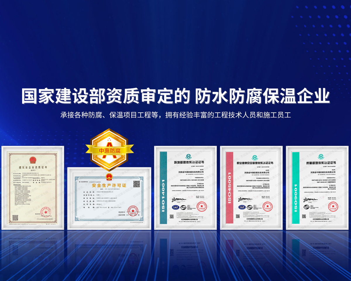 公司經營范圍:防水防腐保溫工程;消防設施工程;建筑裝修裝飾工程;建筑機電安裝工程;電力工程;建筑工程;石油化工工程;工業清洗工程;油罐清洗工程;鋼結構工程;環保工程;模板腳手架工程;電纜防火封堵、防污閃噴涂、外墻外保溫工程;各類施工勞務作業;設備維修、船舶鉚焊、涂裝;電力工程材料、建材、防水材料、防火材料、防腐保溫材料銷售,并相繼通過了GB/T19001-2008idtISO9001:2008GB/T50430-2007質量管理體系認證證書。GB/T24001-2004idtISO14001:2004環境管理體系認證證書。GB/T28001-2011idtOHSAS18001:2007職業健康安全管理體系認證證書。公司是中國防腐蝕于防護協會、中國施工企業管理協會、電力協會和中國鋼結構防水協會會員單位。 公司的經營業務涵蓋了石油、化工、電力、冶金、煤炭、船舶、國防、燃氣、水利、環保、交通運輸、航空及國防軍工和輕紡市政等行業的防腐保溫絕熱設備。鋼結構安裝、防火、防水、金屬噴鍍、聚脲噴繪、陰極保護、防滲透堵漏、玻璃鋼及各種磚版材料襯里、橡膠襯里、煙氣硫和耐酸溶劑腐蝕等工程施工。公司連續十年榮獲“省市先進施工企業”“安全生產先進單位”“重合同,守信用企業”和“AA***資質企業”的稱號。2000年被命名為市級文明單位,2002年被國家工商行政管理局命名為“重合同,守信用的企業”、被中國工業防腐蝕技術協會命名為“防腐蝕企業,能源節約及環境保護領域有豐富的經驗和***的業績。工程一次交驗合格率100%。其中攀枝花鋼鐵公司煉鐵廠四號高爐及熱風爐防腐工程、上海寶鋼公司煤氣柜防腐工程、撫順石油一廠裝置防腐項目、齊魯石化公司稀烴廠高塔防腐工程、吉林化學工業公司煉油廠油罐防腐工程、天津石化熱電廠六號爐頂棚聯絡管保溫工程、大慶油田(太倉)力神泵業工程、中國化學工程第十一建設工程、中原油田勘探局工程、中國石化銷售有限公司華北分部、魯皖輸油管道工程、貴州開磷息烽合成氨工程、陜西黃陵煤化工程、中國石油天然氣西部管道塔里木輸油工程、邯鋼集團邯寶鋼鐵公司煉鐵工程、德州供電工程、吉寶(南通)船廠工程,偃師華潤熱力工程、鄭州熱力總公司。 河南省中惠防腐安裝有限公司愿以豐富的施工經驗,***的技術,***的設備,***的管理,***的服務,竭誠為國內外廣大的用戶提供***滿意、******的工程作品。 我公司愿與國內外同仁一道,團結協作,共同推進防腐蝕行業發展! 公司地址:河南省長垣縣建設路北段360號 固定電話:0373-8866488 郵編:453400 網址:http://www_zhff_com_cn.jnxeny.com